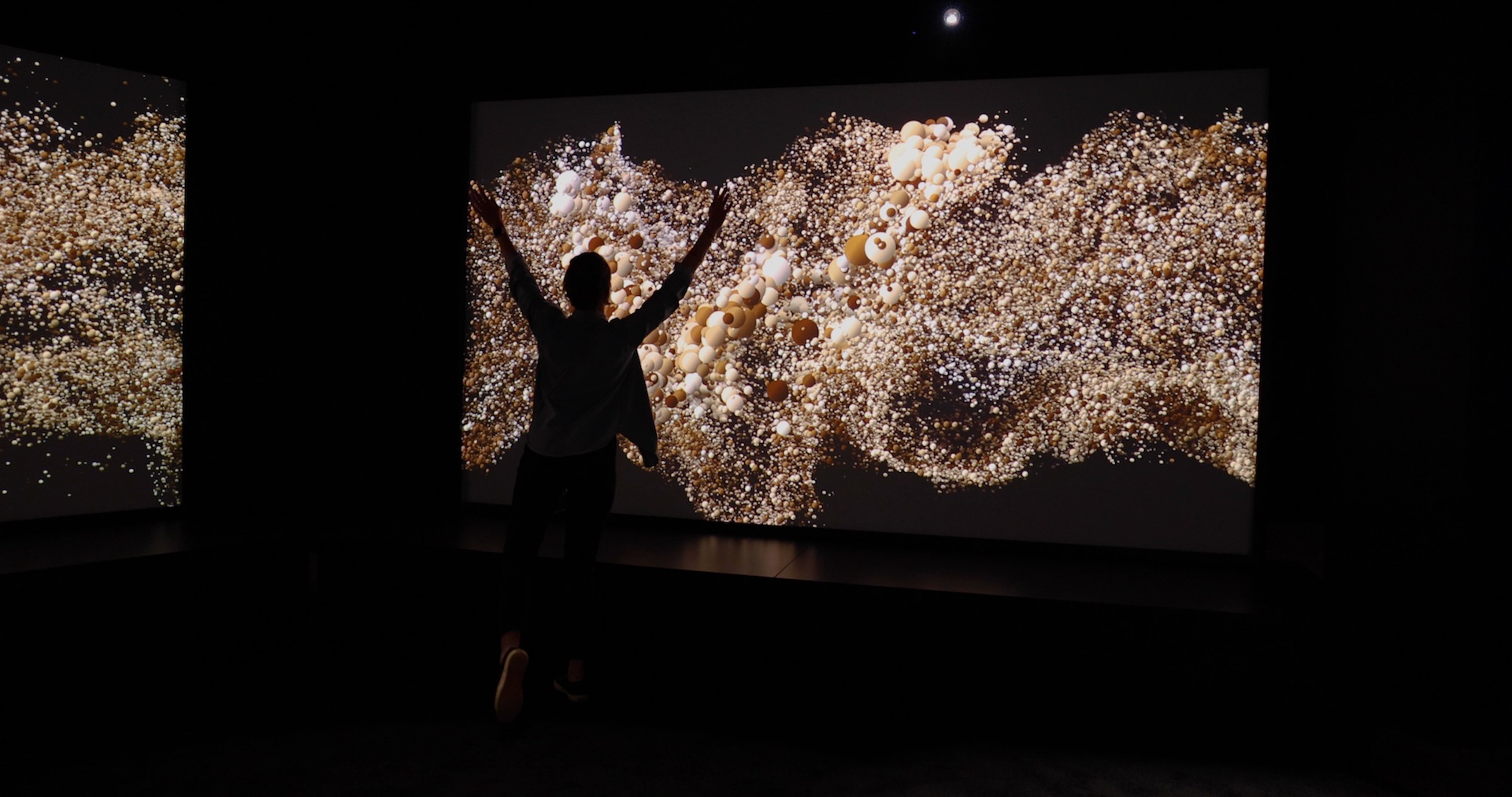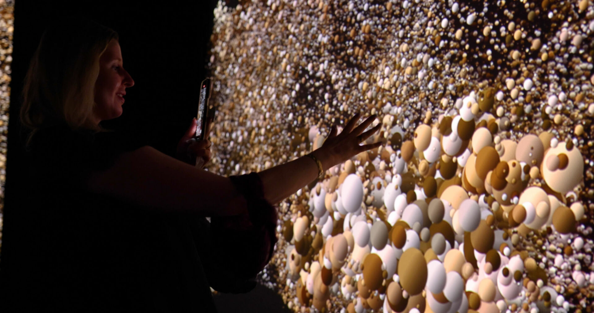 At the heart of a semi-transparent cube, visitors trigger a real-time visual work via Lidar technology. Bodies become a source of transformation: constellations of skin appear, accompanied by spatialised sounds. A poetic audiovisual creation made possible by TouchDesigner, Notch and Studio Start-Rec.