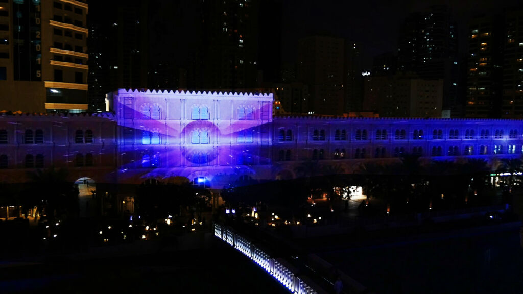 A poetic mapping composed of moving pixels, blending incandescent geometry and organic arabesques on the monumental facades of Al Qasba.