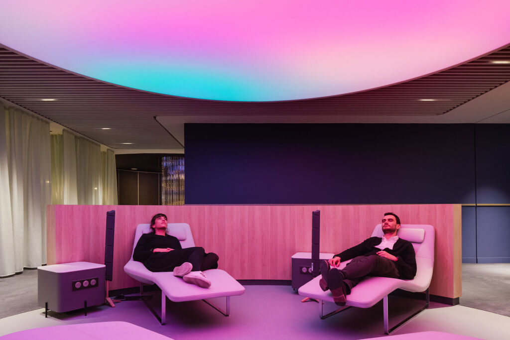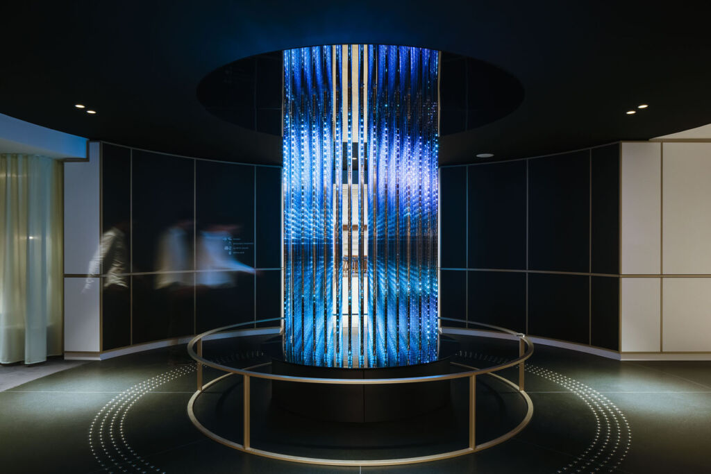 Le couloir d’entrée accueille plus de 20 écrans générant des visuels uniques à chaque passage. Une rotonde en LED incarne le vol aérien. Un espace détente invite à la contemplation lumineuse.