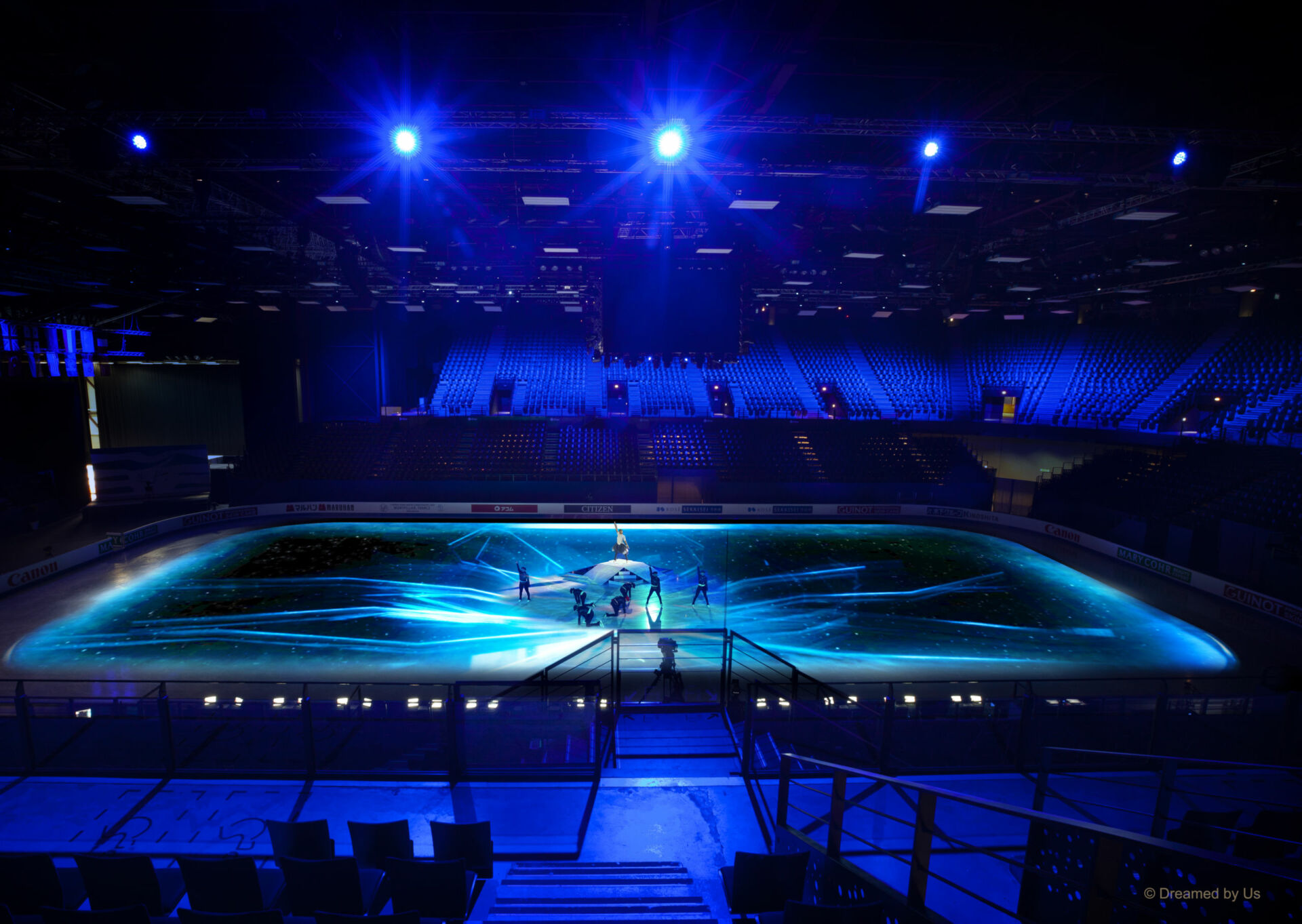 Superbien conçoit des contenus visuels en dialogue avec les mouvements des patineurs, en se basant sur les captations des répétitions pour adapter le mapping sur glace à leurs chorégraphies.