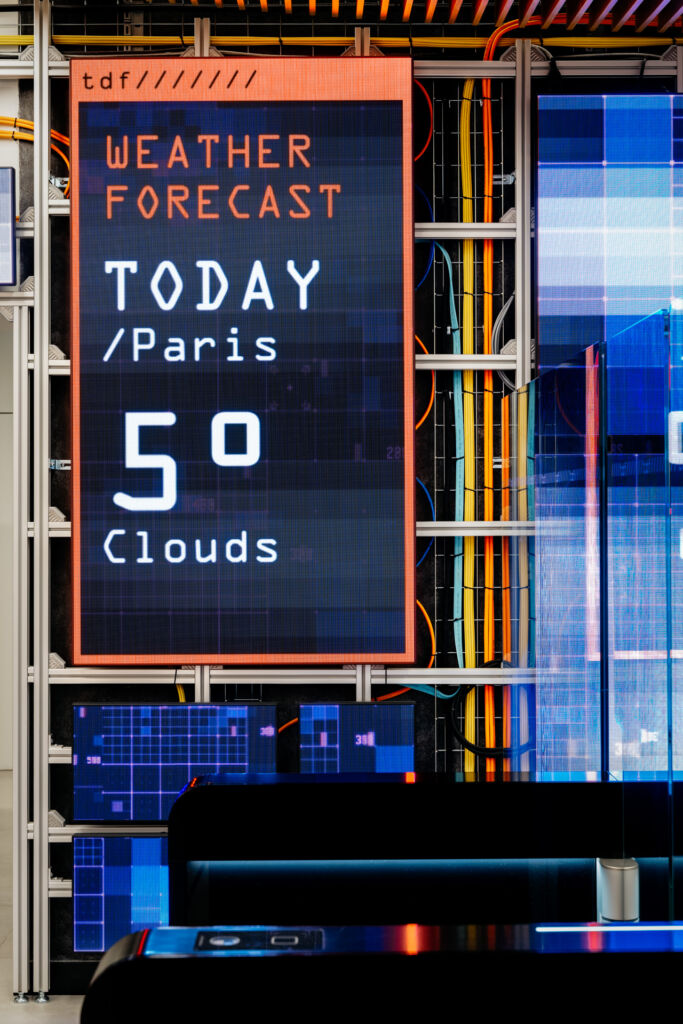 Grâce au logiciel VVVV, les graphismes s’animent selon des flux de données réels : consommation électrique, cloud, luminosité, météo, etc. Cette installation vivante reflète l’activité du bâtiment et crée une connexion visuelle entre les usagers, tout en respectant les codes graphiques de Digital Factory.