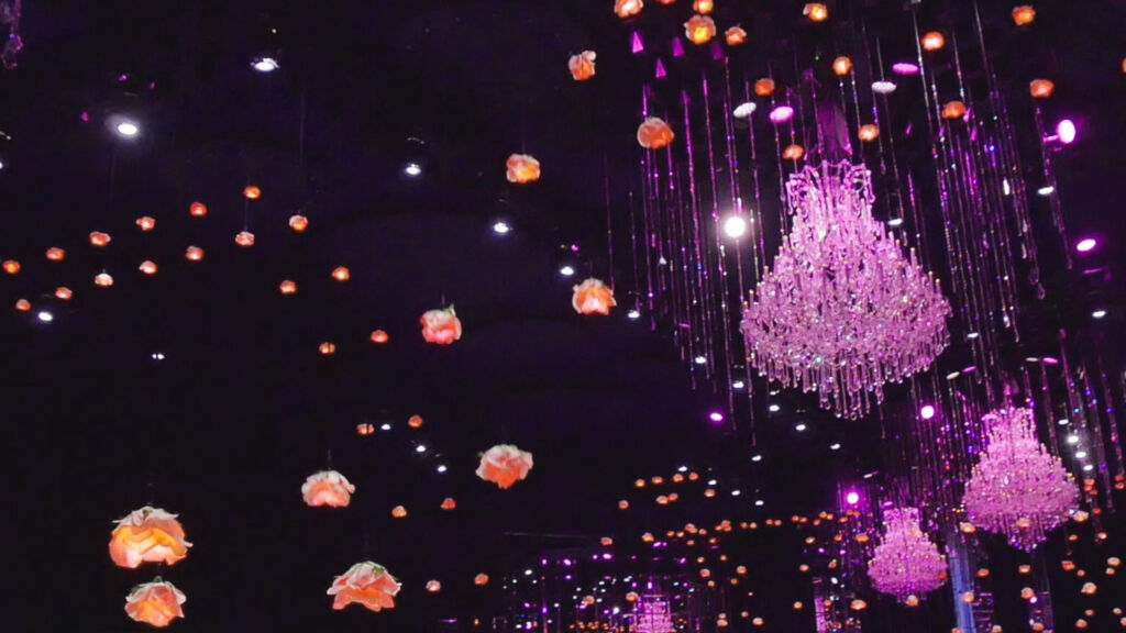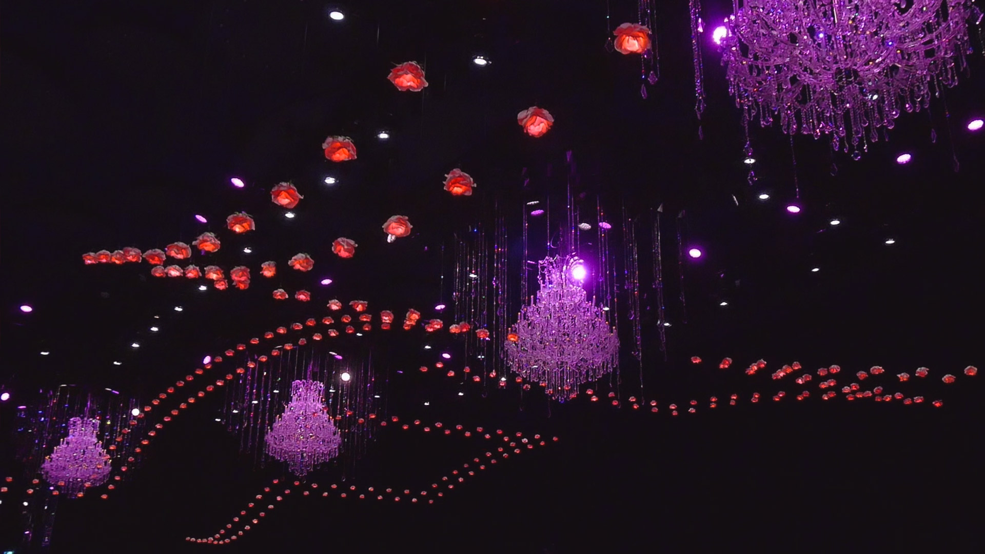 Un ballet cinétique de roses lumineuses suspendues compose une série de tableaux oniriques et modernes pour incarner la sensibilité de la marque.