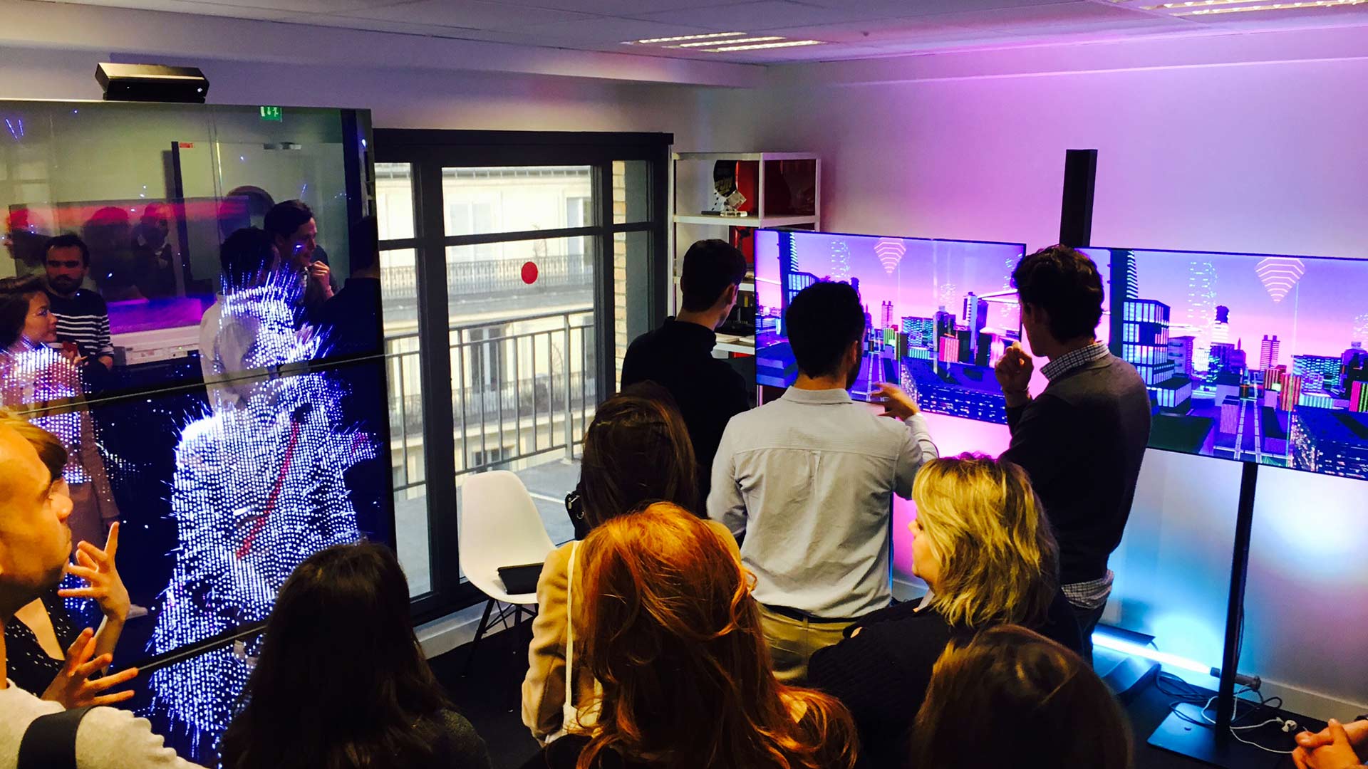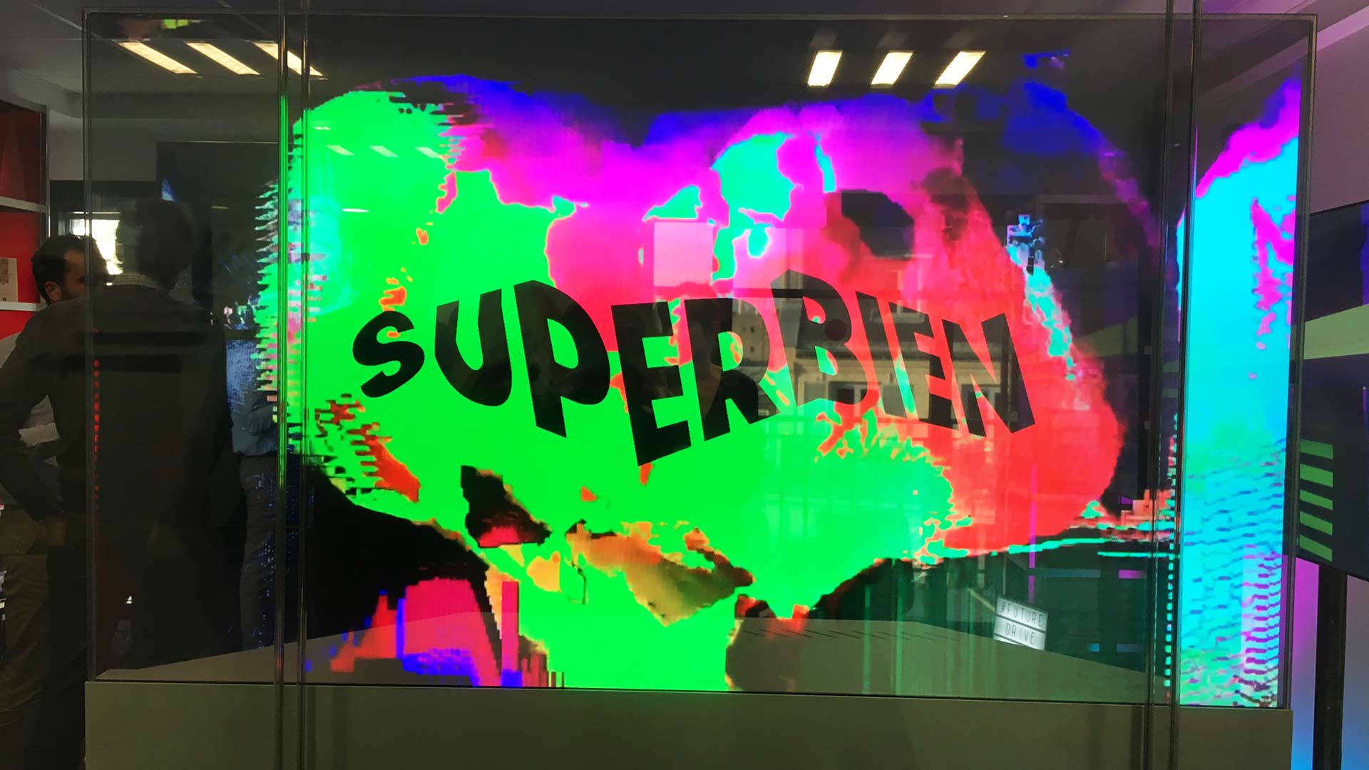 Superbien conçoit trois installations successives : une réflexion déstructurée en particules, un serious game collaboratif et une démonstration sur écrans OLED transparents.