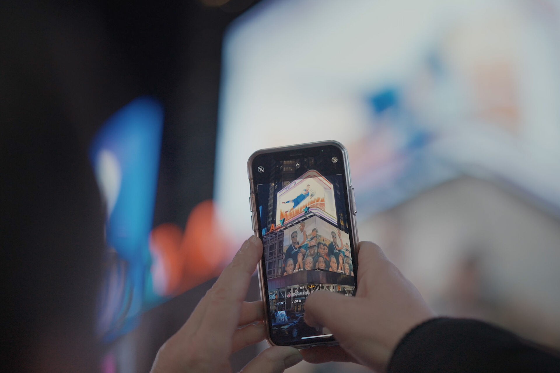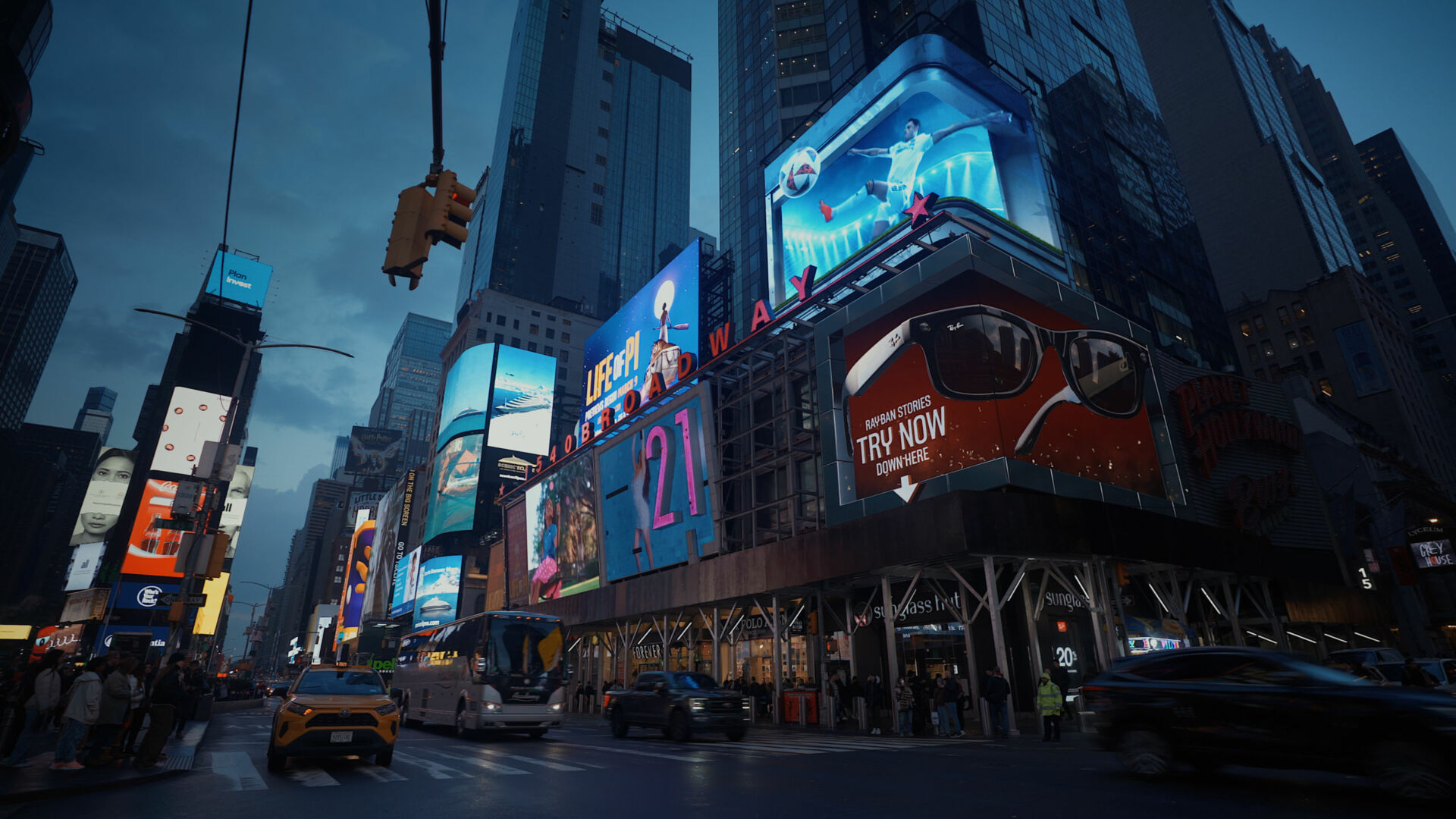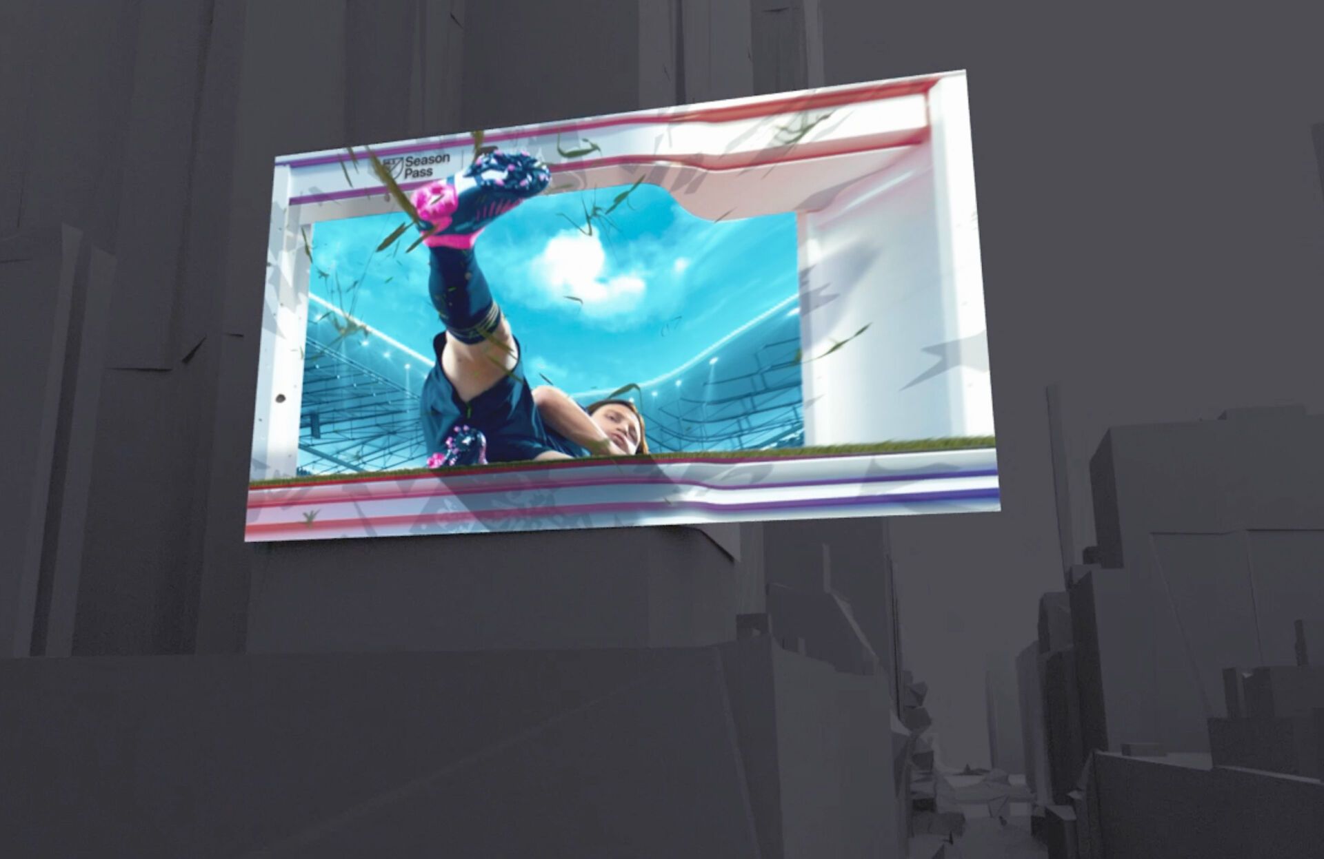 Une anamorphose 3D dynamique où les stars du foot interagissent avec l’espace urbain emblématique de Times Square.
