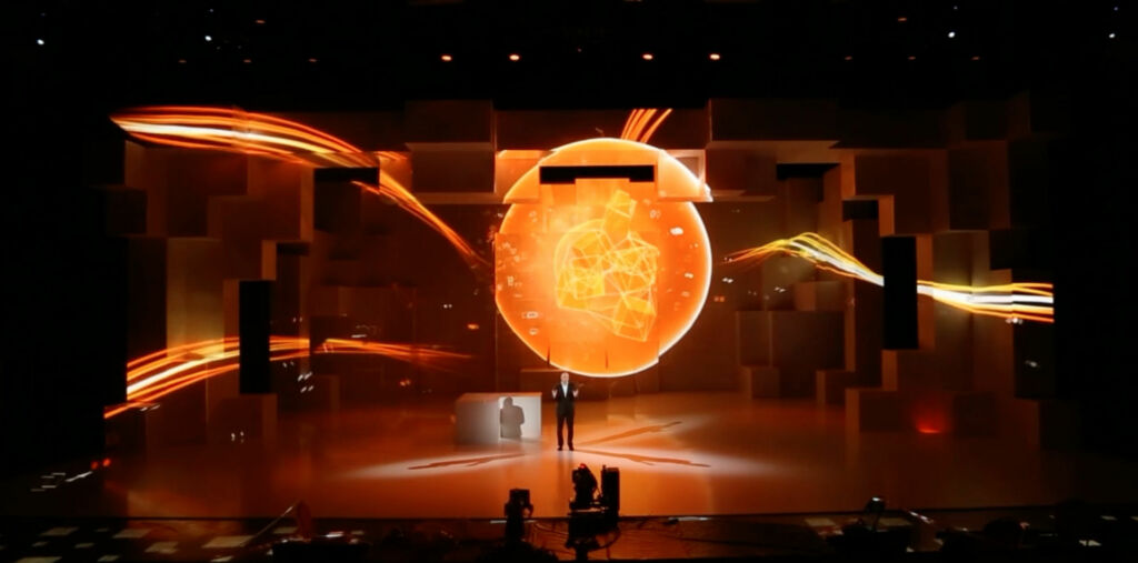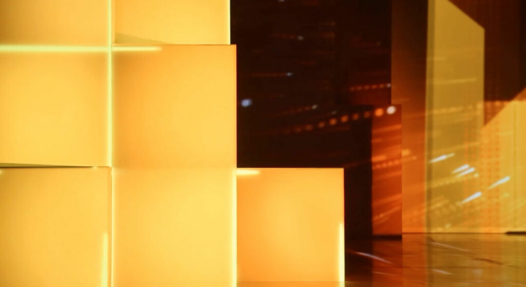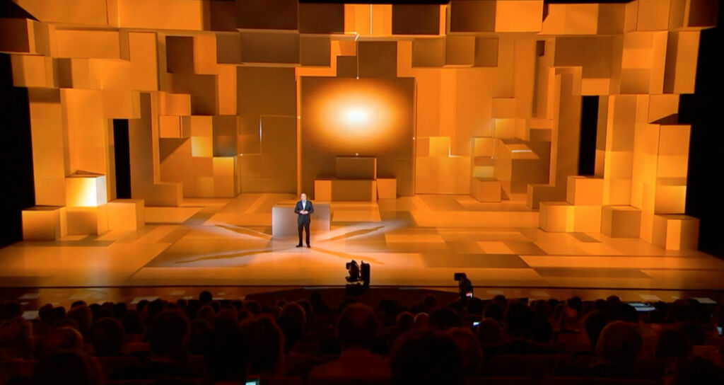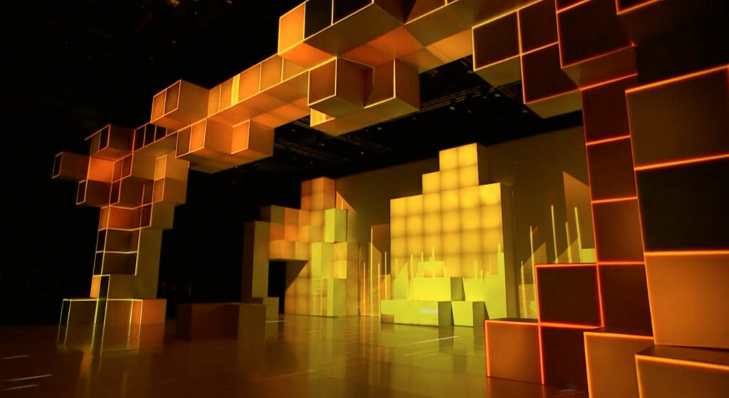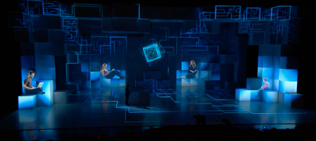 Superbien designs an innovative video mapping experience projected onto an evolving cubic stage design, graphically illustrating Orange’s technologies.