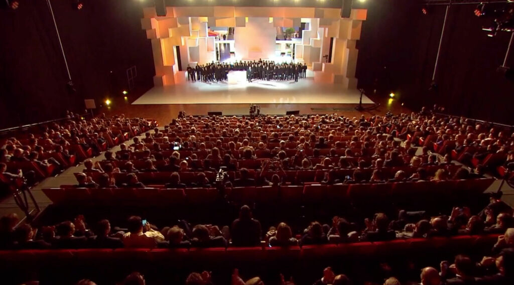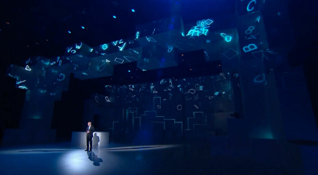 The decor, made up of cubic volumes, constantly evolves over 40 minutes, sequentially showcasing urban landscapes, networks, data clouds, and daily-life scenes through 780,000 HD images produced by Superbien.