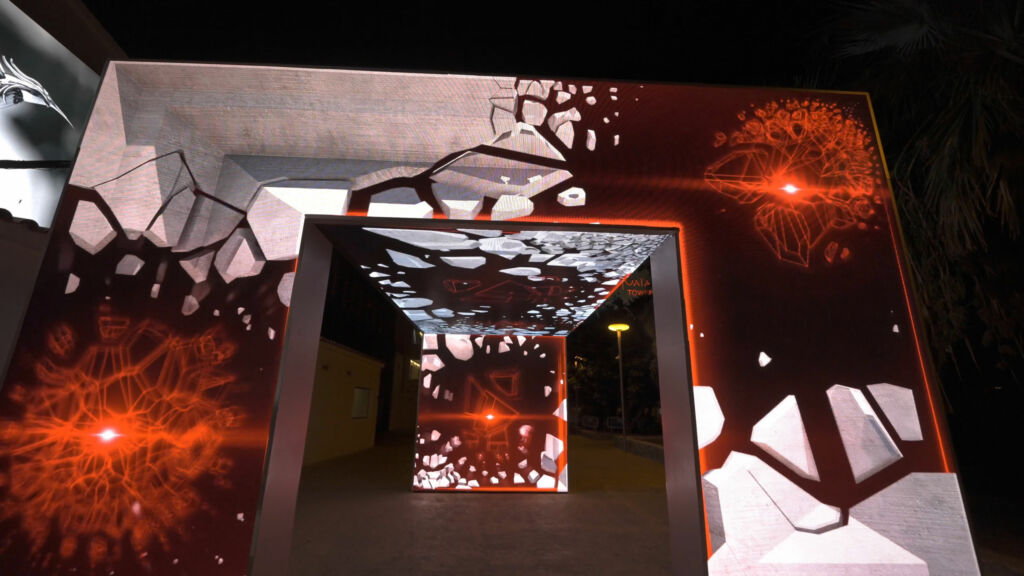 Pensée comme une passerelle vers l’univers musical du club, l’arche mêle écrans digitaux et contenus animés pour accueillir les fêtards dans un tunnel sensoriel. Véritable totem du lieu, elle incarne l’identité de ce temple de la fête où se produisent les plus grands DJ.