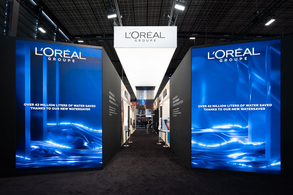 The content combines textures, fluids, particles and materials inspired by living organisms to embody the ‘Beauty for Each’ vision. The two screen columns, placed at the entrance to the stand, invite visitors to enter a sensory visual ecosystem where technology, inclusion and sustainability intertwine.