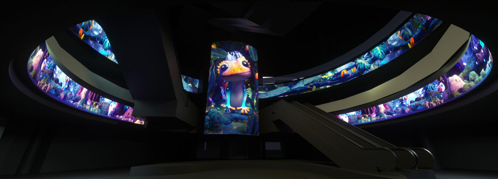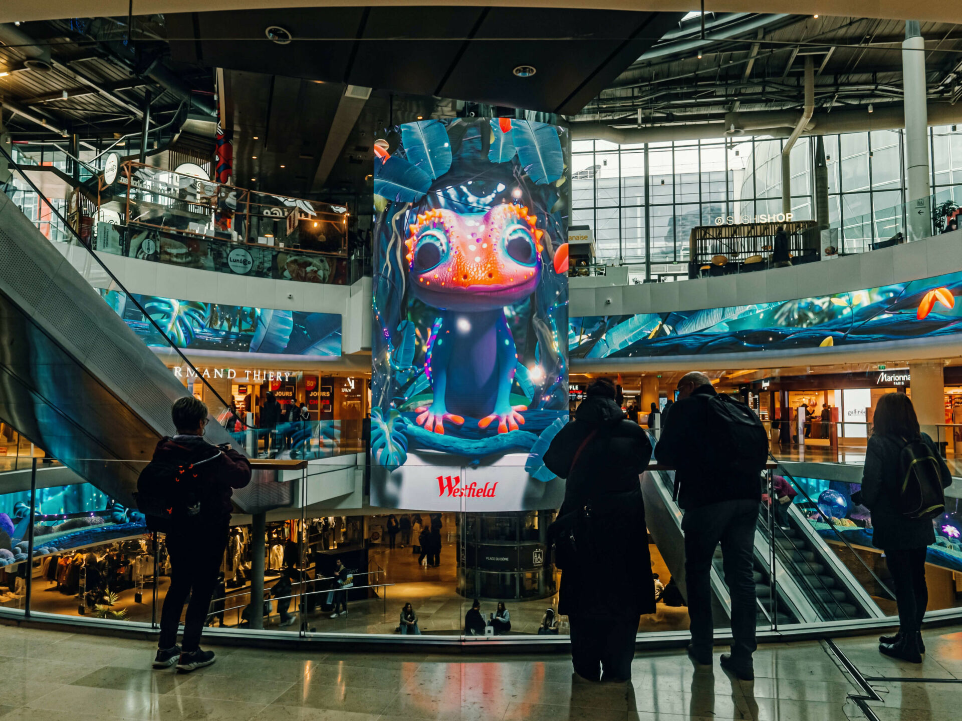 Au cœur du centre Westfield Les 4 Temps à La Défense, un nouvel écran 3D convexe monumental transforme l’atrium en un théâtre immersif. Superbien conçoit un récit onirique autour d’un gecko espiègle, captant l’attention au sein de cet environnement ultra commercial.