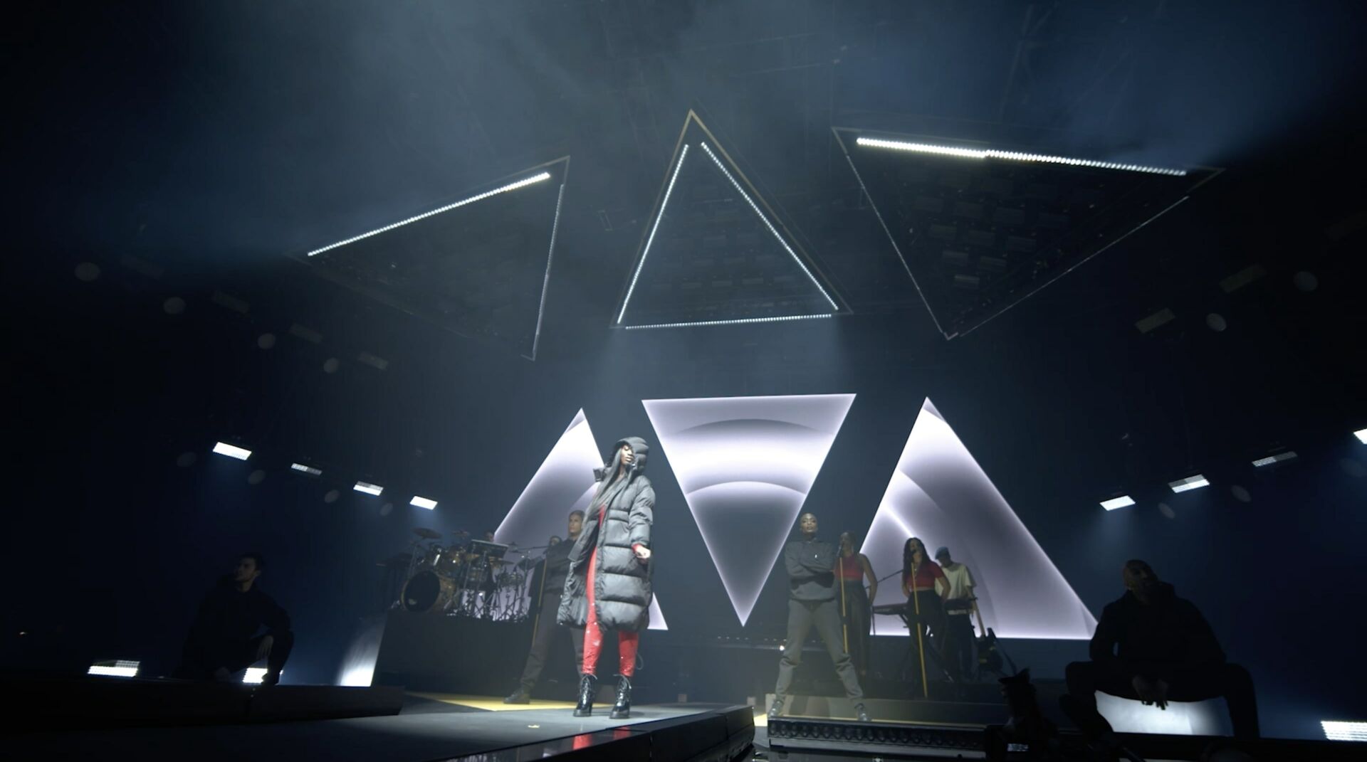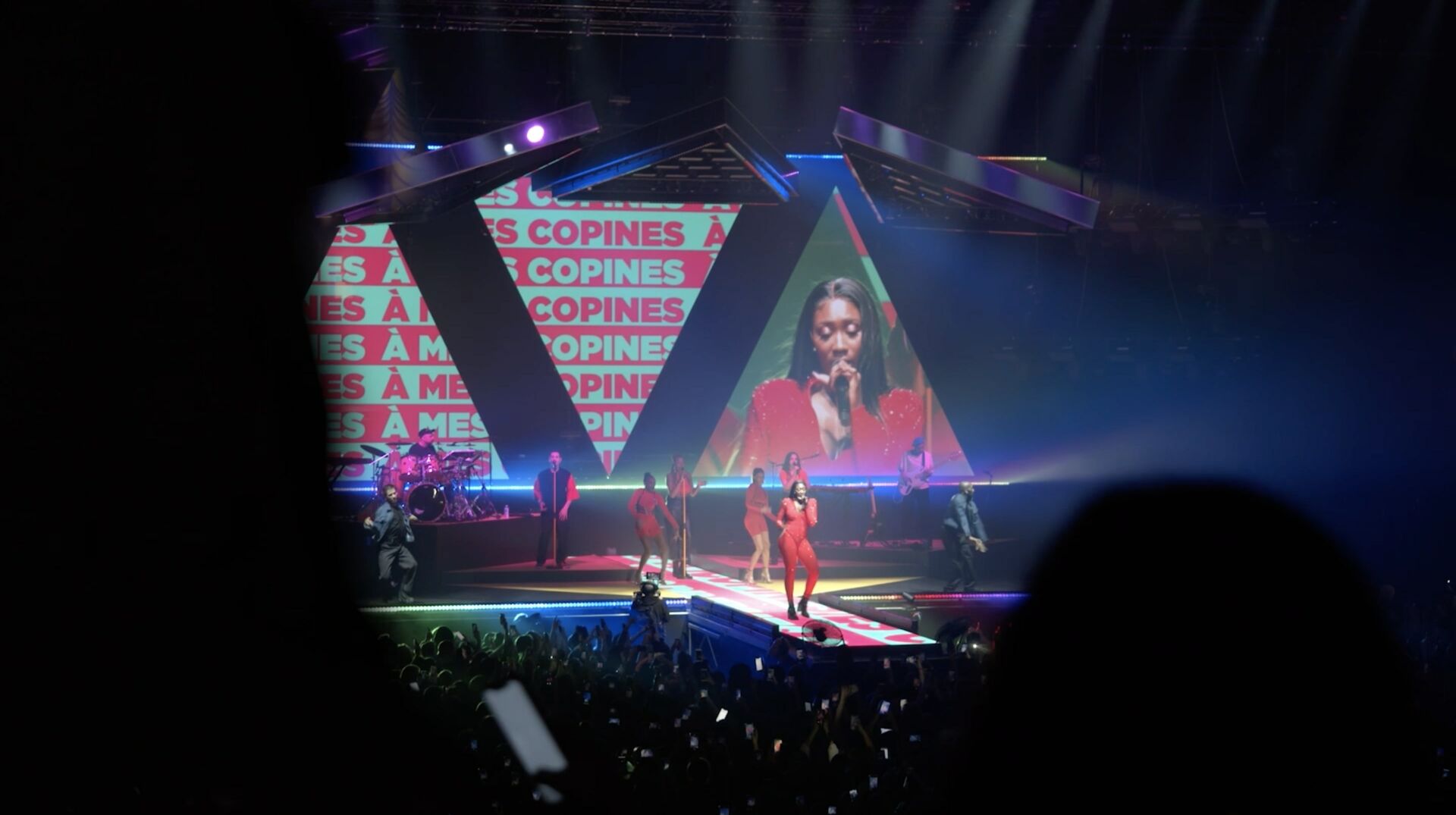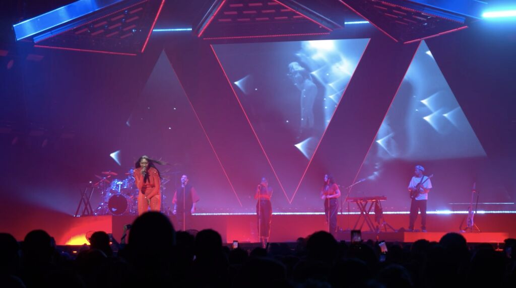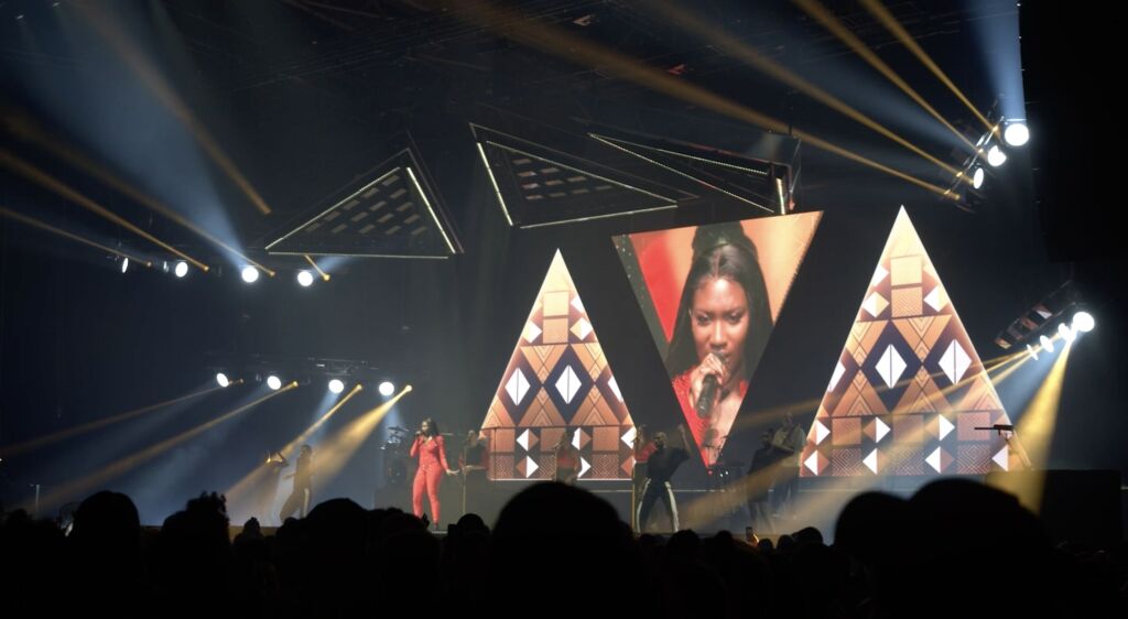 Each visual act mirrors the pulse of the performance—waves of light, dynamic textures, and bold compositions move in sync with the music. This scenographic writing, both technical and emotional, extends Aya Nakamura’s artistic language and draws the audience into her universe.