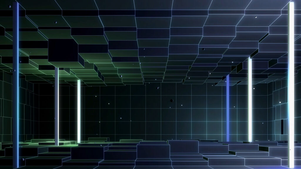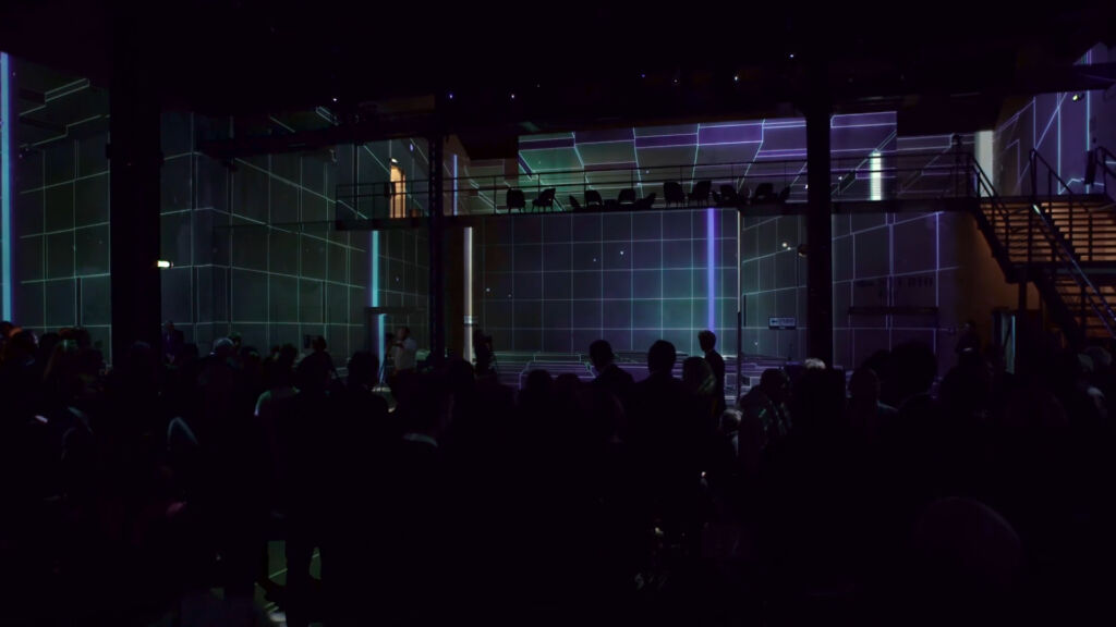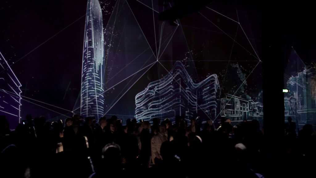The studio designed an evolving scenography made up of video-mapped particles. This moving architectural structure illustrates changes in the real estate sector and highlights Bouygues Immobilier's flagship projects.