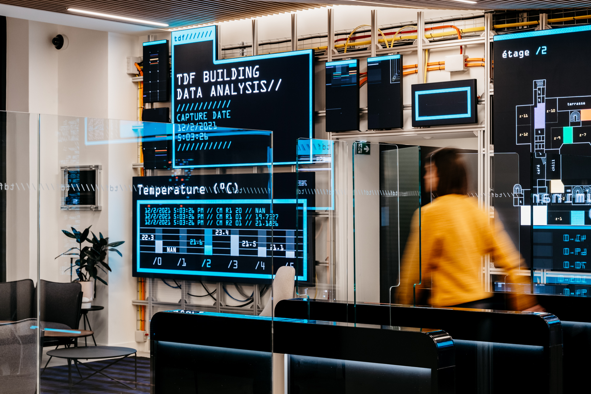 Using VVVV software, the graphics are animated according to real data flows : electricity consumption, cloud, brightness, weather, etc. This living installation reflects the building's activity and creates a visual connection between users, while respecting Digital Factory's graphic codes.
