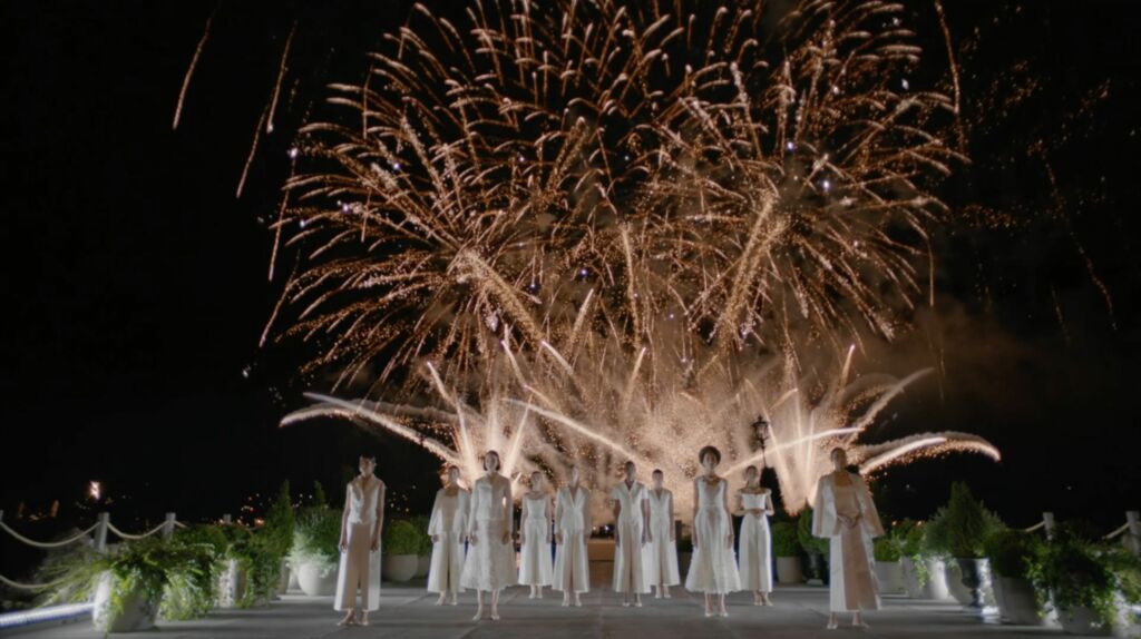The façade and interior of the villa come to life under the light projections. The play of light highlights the curves of the building and interacts with the floral compositions. A subtle and refined mapping accompanies the dinner and fashion show, revealing the timeless elegance of the collection.