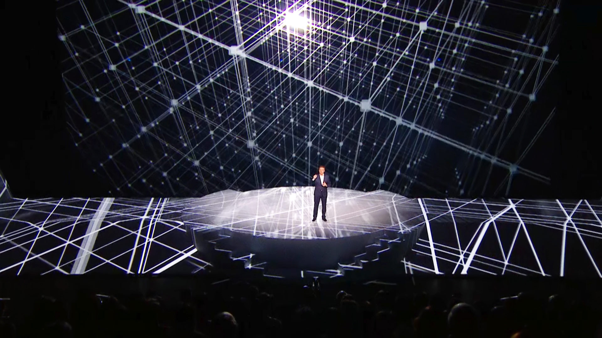 Superbien developed a live video system that dynamically reacts to the CEO's speech, projected onto an immersive stage set. The show culminates with the appearance of the logo, symbolizing augmented identity.