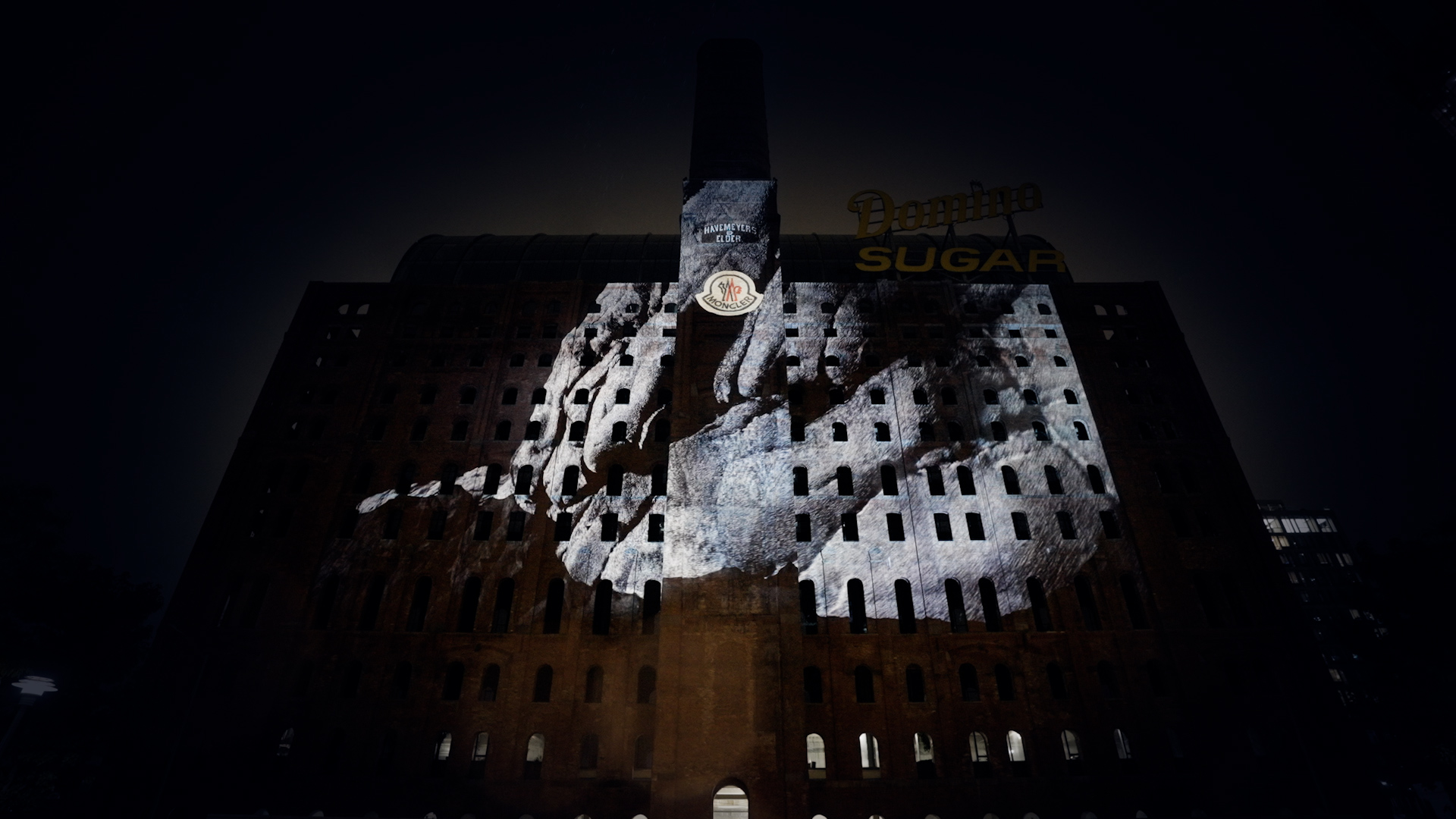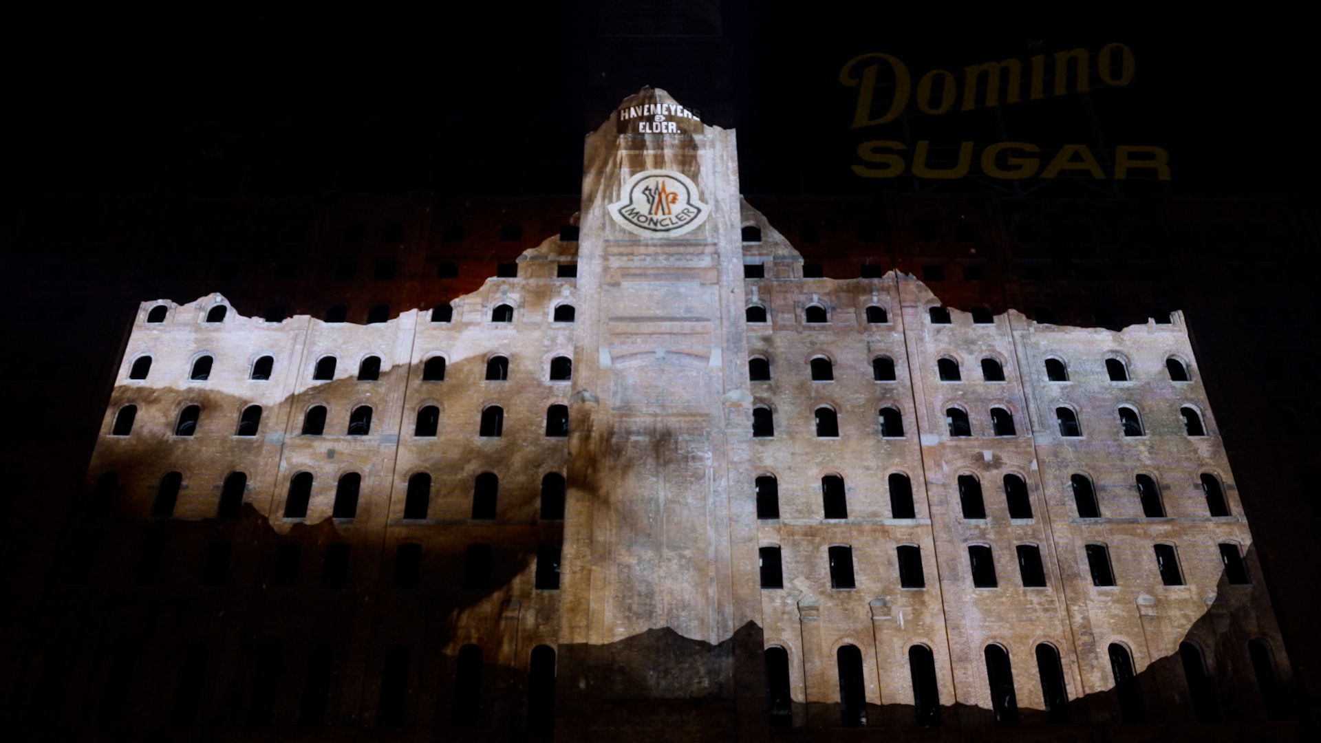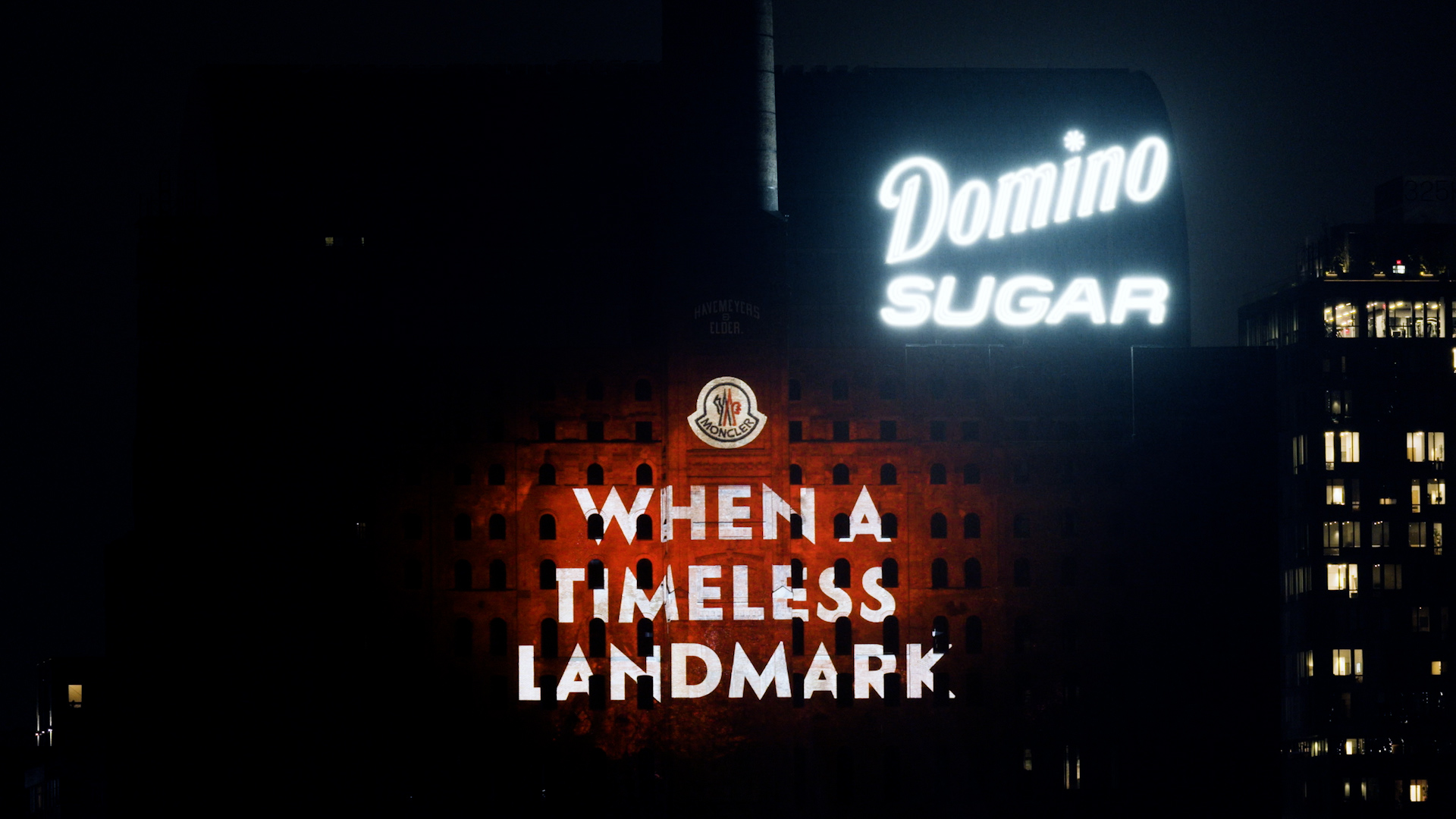 Moncler unveils a visual campaign on the Domino Sugar Factory in Brooklyn, highlighting the timelessness of its new collection through a unique architectural projection.