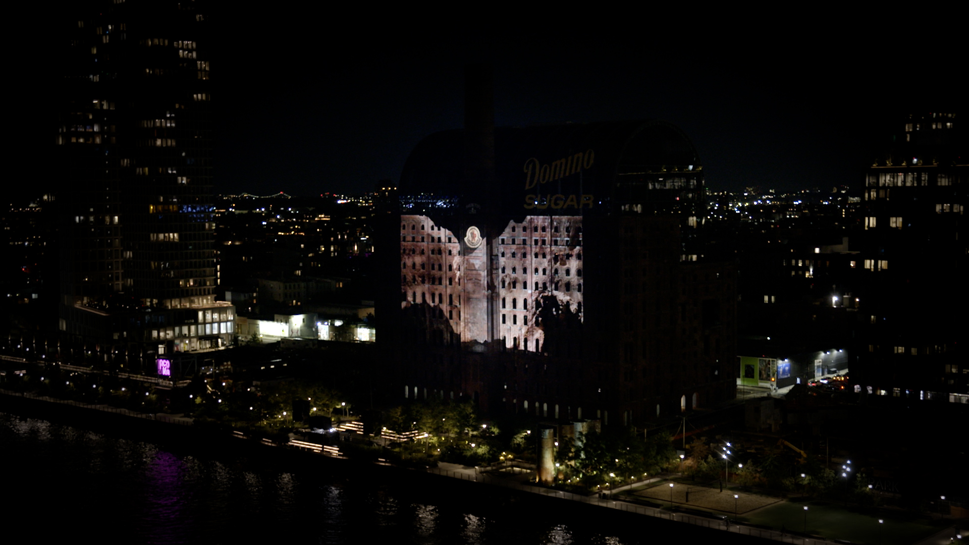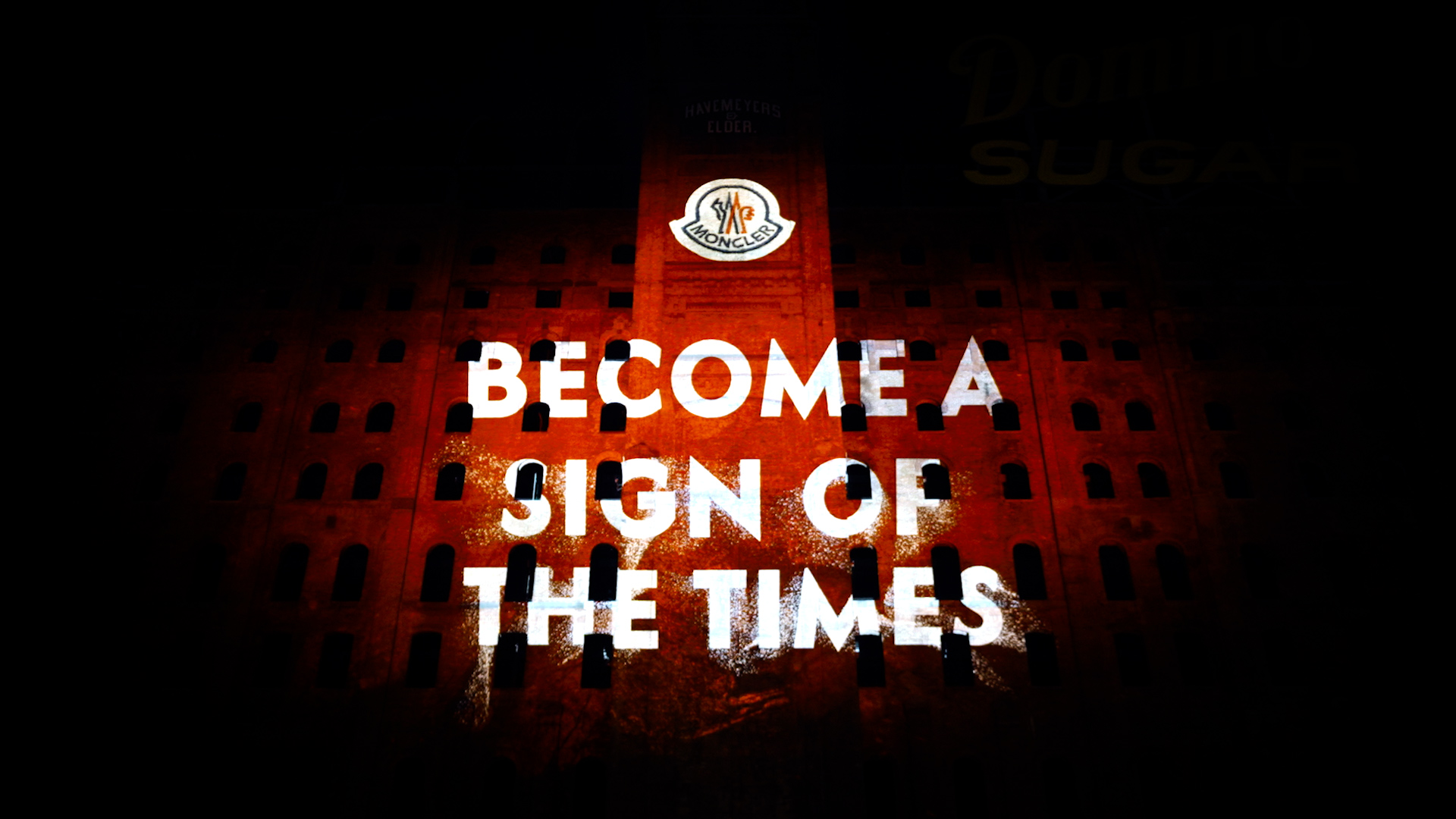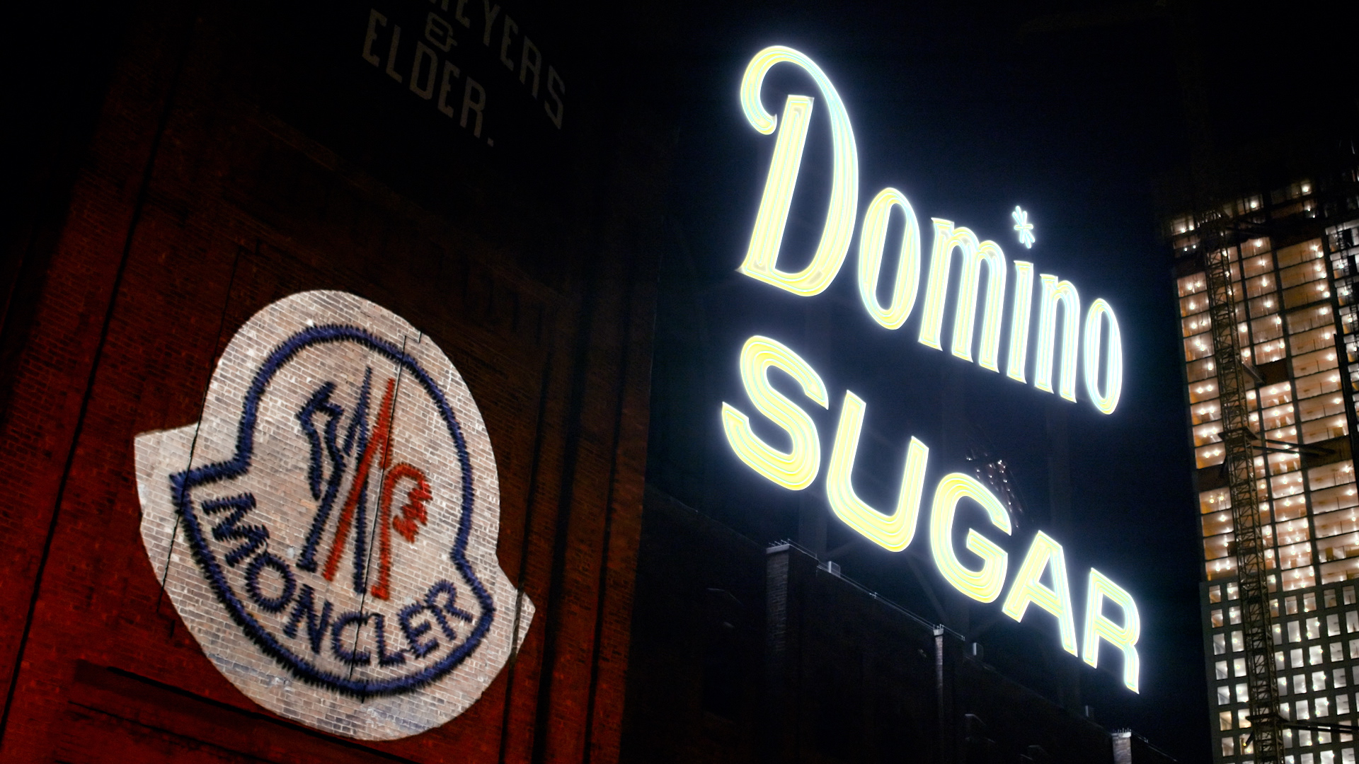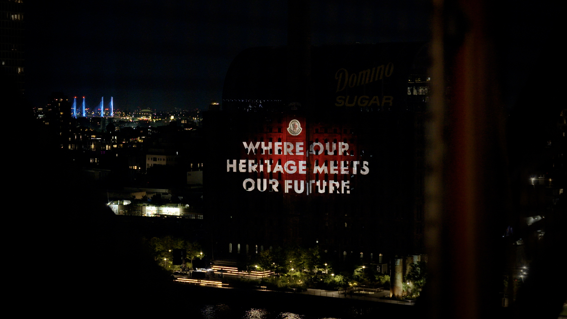 Moncler unveils a visual campaign on the Domino Sugar Factory in Brooklyn, highlighting the timelessness of its new collection through a unique architectural projection.