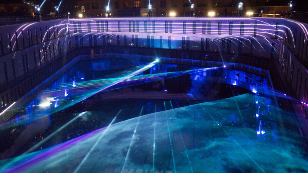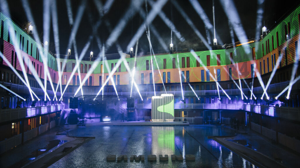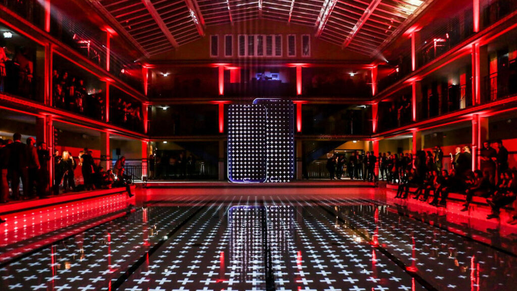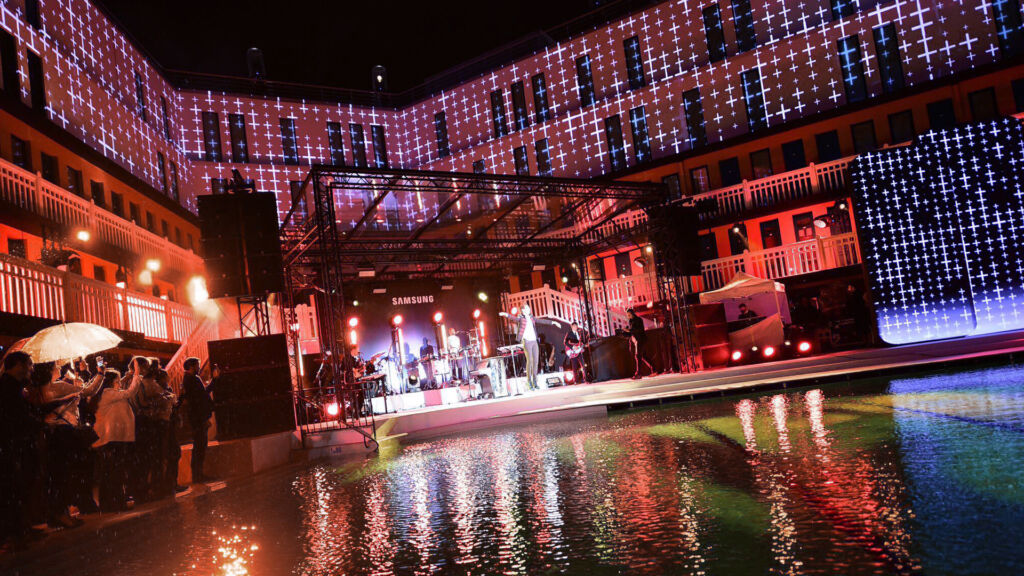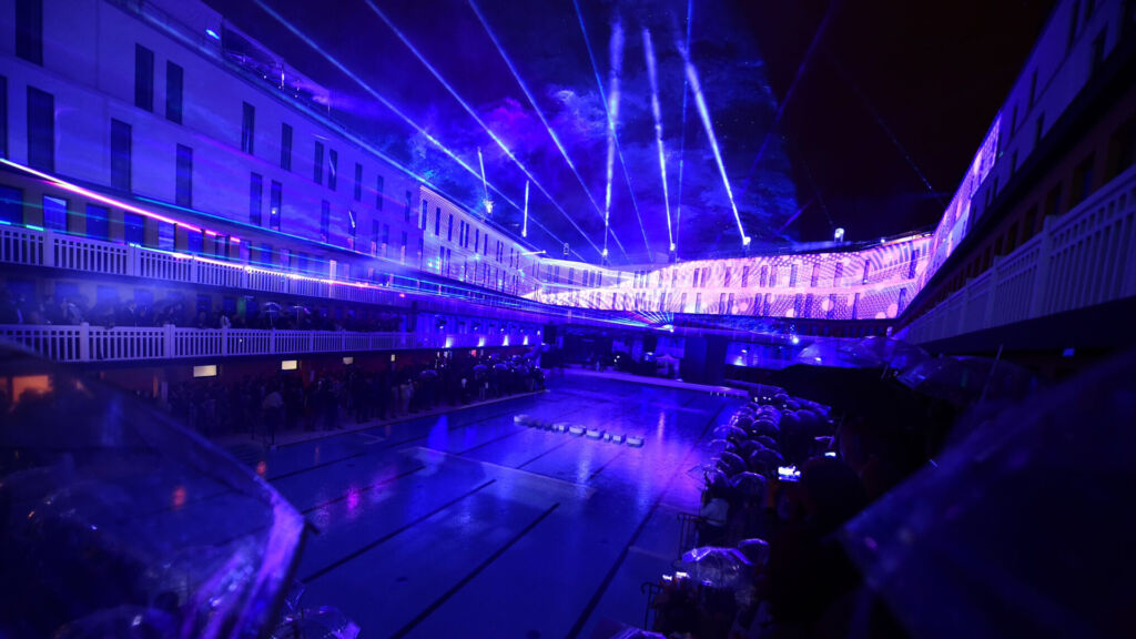 The scenography was inspired by the curves and finesse of the smartphone, with a visual device integrated into the very architecture of the venue. Video mapping, graphic projections and lighting effects transform the pool into an animated screen, offering guests a sensory immersion into the world of the new Samsung model.
