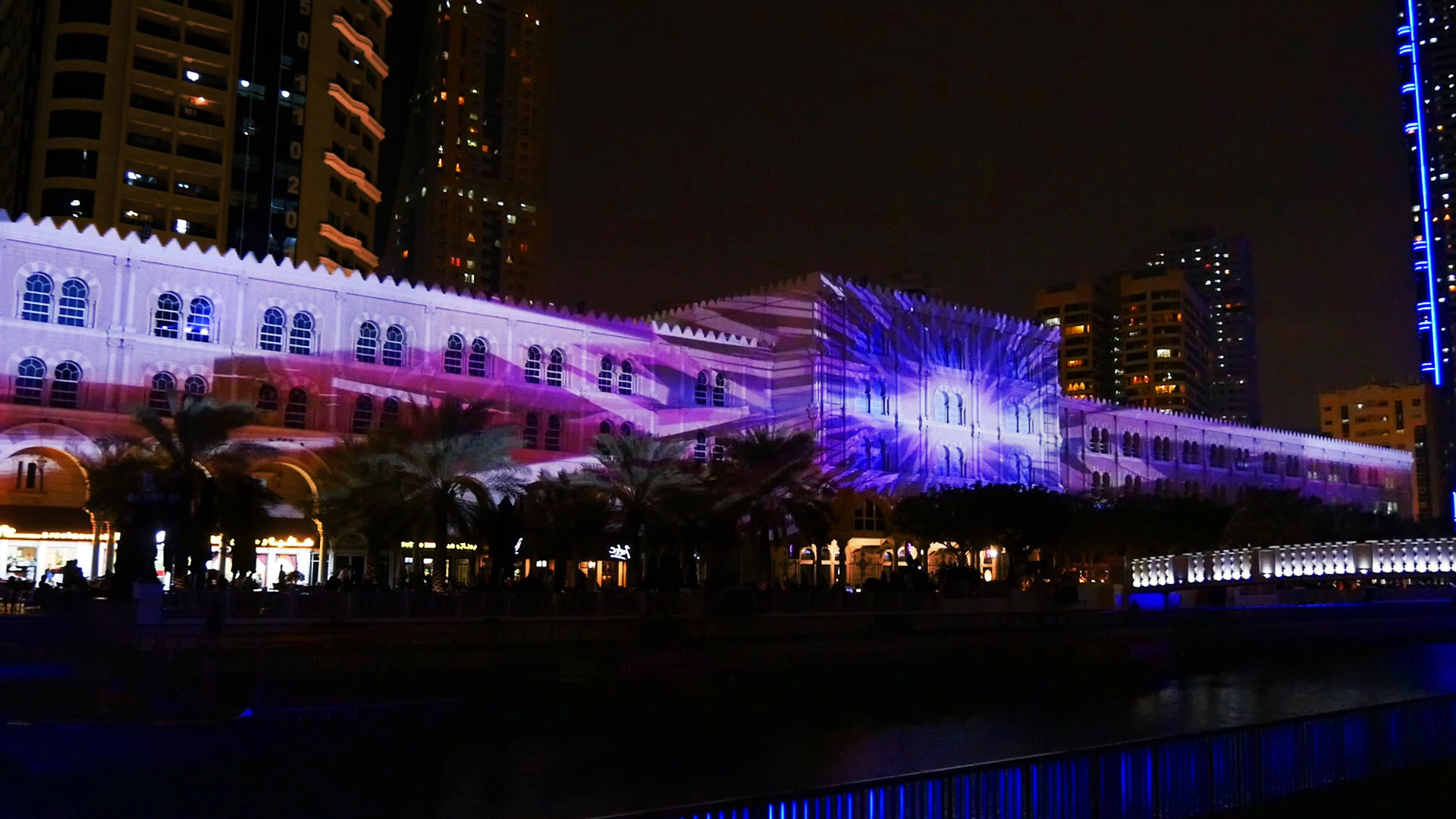 Superbien designed Hemera for the 2016 Sharjah Light Festival, a tribute to light and travel, projected onto the facades of the Al Qasba canal.