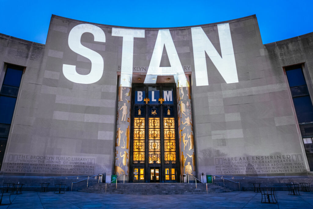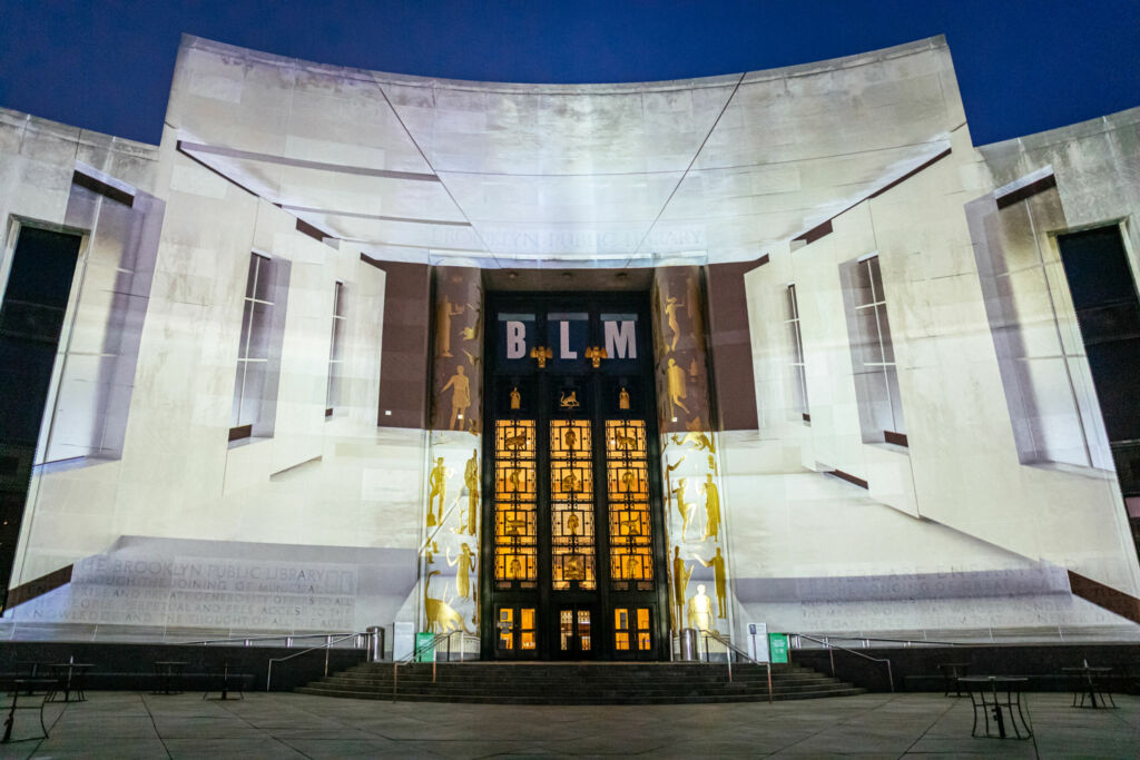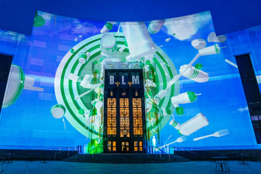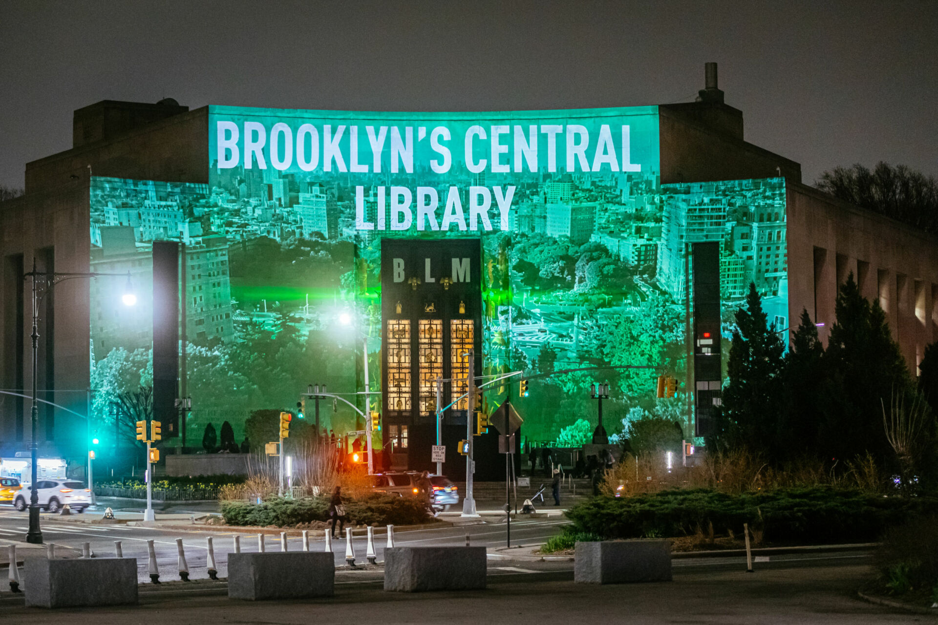 Projection on the facade of the Brooklyn Public Library, powered by an eco-friendly generator.