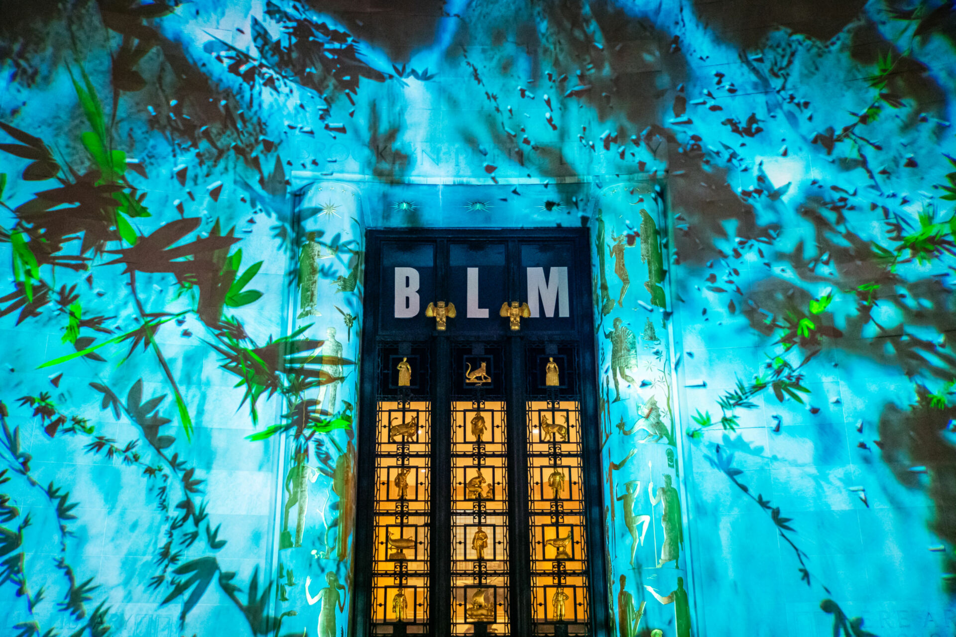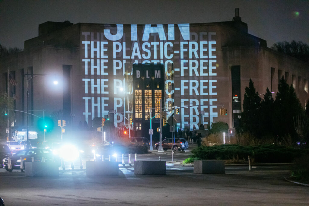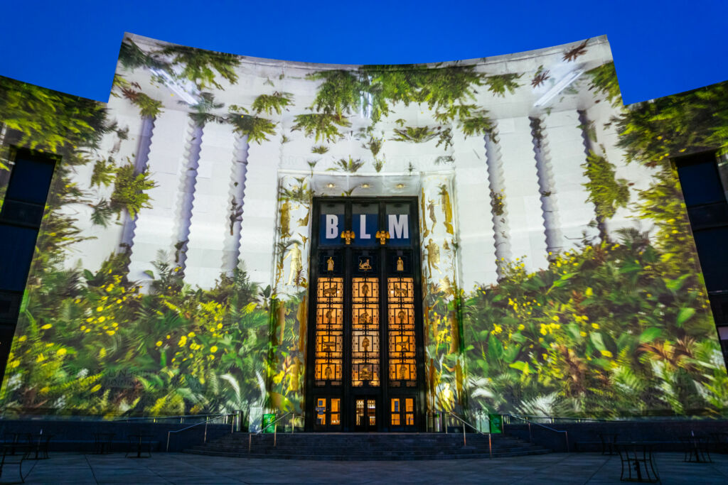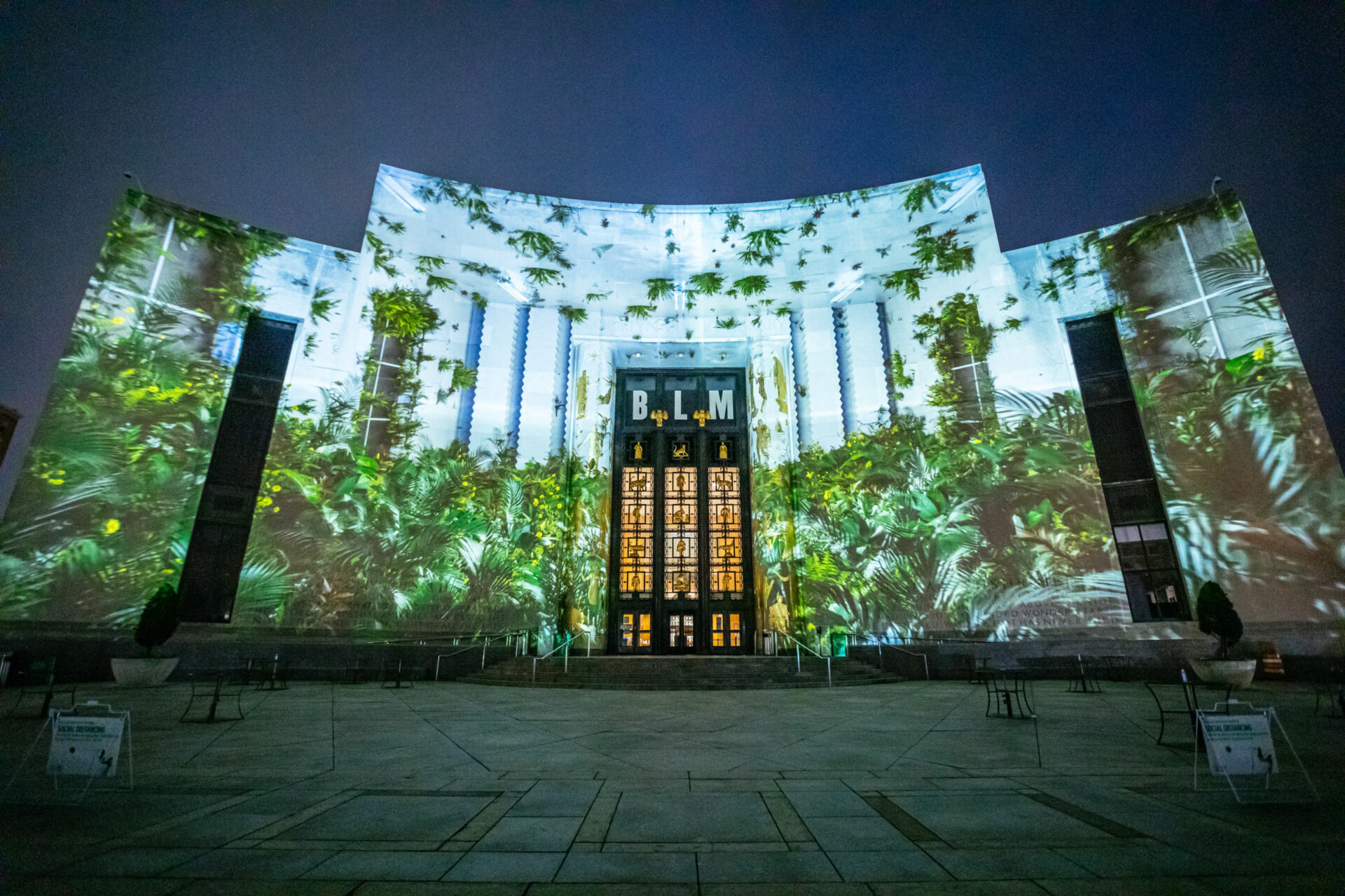 Projection on the facade of the Brooklyn Public Library, powered by an eco-friendly generator.